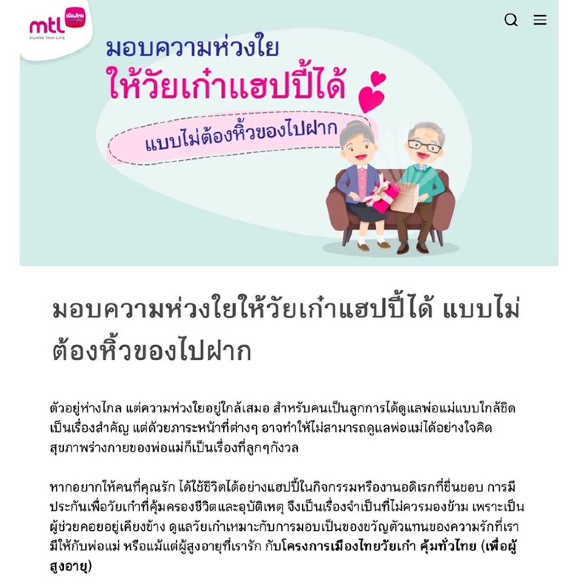 ประกันชีวิตผู้สูงอายุ โครงการเมืองไทยวัยเก๋าคุ้มสุขใจ สำหรับผู้สูงอายุ 50 - 80 ปี ไม่ต้องตรวจสุขภาพมั่นใจได้ง่ายๆด้วยเบี้ยประกันเมืองไทยวัยเก๋าเบี้ยคงที่ตลอดสัญญา